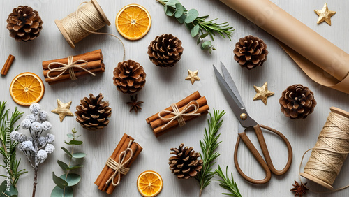 Festive holiday gift wrapping design with cinnamon sticks orange pinecone and accessories