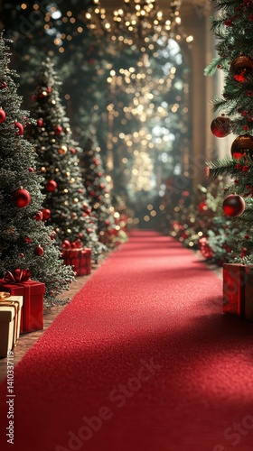 christmas, holiday, pathway, festive, tree, decoration, gift, red carpet, light, ornament, celebration, indoor, cosy, winter, shiny, present, seasonal, joy, family, togetherness, gathering, warmth, cheer, event, winter landscape, classic, tradition, bokeh, ambience, inviting, happiness, love, serene, enchanting, magical, cosiness, bright, sparkle, nostalgia, jolly, cheerful, spirit, holiday season