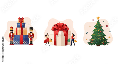 christmas, gift, holiday, season, decoration, festive, winter, celebration, joy, tree, ornament, light, present, shopping, bow, ribbon, nutcracker, soldier, toy, family, gathering, warmth, cheer, tradition, surprise, excitement, winter landscape, snow, cold, cosy, atmosphere, eve, day, new year, party, event, illustration, art, design, graphic, vector, flat, style, scene, collection