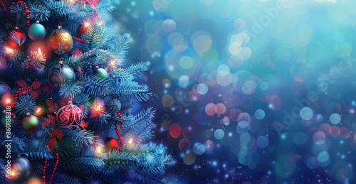 Festive image of a decorated Christmas tree with colorful ornaments and glowing lights
