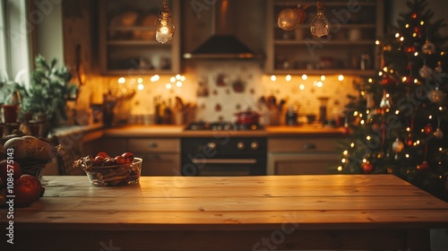 Festive kitchen backdrop with empty wooden table in foreground, Christmas tree and twinkling lights creating a warm, cozy atmosphere for holiday cooking and gatherings