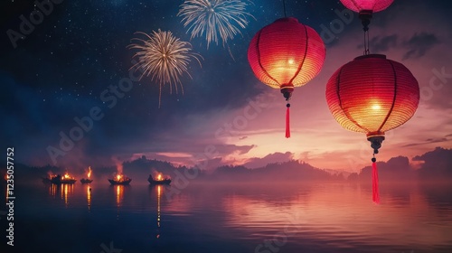 lantern, red, chinese, festival, celebration, fireworks, night, sky, star, water, lake, calm, peaceful, serene, tranquil, beautiful, scenic, colourful, vibrant, glowing, illuminated, light, fire, boat, burning, misty, foggy, twilight, dusk, sunset, horizon, landscape, mystical, magical, tradition, culture, asia, elegant, romantic, peace, joy, happiness, hope