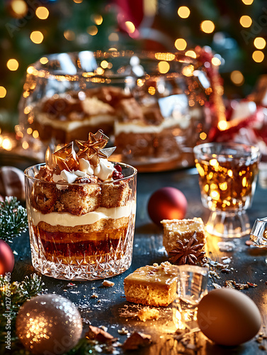 dessert, trifle, christmas, holiday, glasses, festive, sweet, creamy, treat, caramel, cake, custard, fruit, celebration, party, delicious, epicure, indulgence, deliciously, background, blurred, food photography, still life, dark background, christmas tree, decoration, ornament, light, bokeh, closeup, star anise, christmas bauble