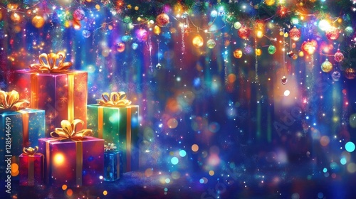 Festive Merry Christmas and New Year background with glittering lights, beautifully wrapped gifts, and cheerful holiday decorations.