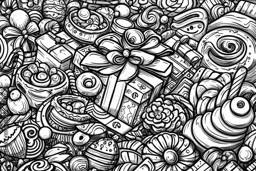 christmas, holiday, gift, present, sweet, candy, chocolate, cookie, bakery, dessert, pattern, seamless, background, texture, monochrome, black-and-white, doodle, drawing, hand-drawn, festive, celebration, winter, design, element, graphic, ornate, detail, decorative, whimsical, joyful