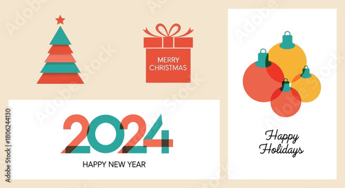Festive New Year 2024 Celebration with Christmas Tree, Gifts, and Ornaments for Holiday Greetings
