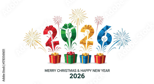2026, new year, christmas, happy new year, merry christmas, celebration, fireworks, gift box, present, holiday, festive, winter, season, greeting, card, design, illustration, graphic, background, white background, colourful, red, green, gold, blue, number, year, event, party, joy, excitement, countdown, celebrate, announcement, poster, banner, template, modern, abstract, art, creative, decoration, tradition, festivity