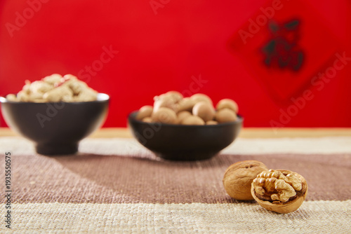 festive, year, grocery, still, life, walnut, cashew, nut, red background, chinese new year, still life, celebration, grocery, natural food, prosperity, holiday, epicure, food photography, closeup, blurred background, depth of field