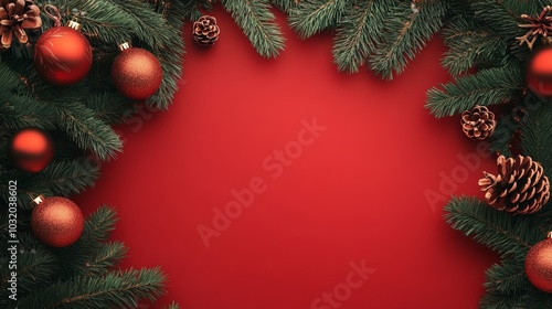 Festive Pine Branches with Red and Gold Christmas Ornaments on Red Background