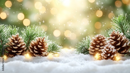 Festive pine cones, snow, lights, and evergreen branches on a blurred background.