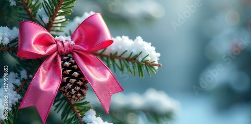 Festive pink ribbon tied to a winter tree branch with pinecones, pinecone, snowy, ribbon