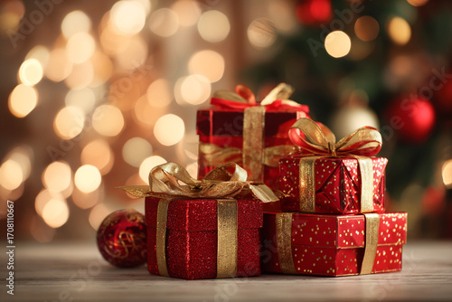 Festive red and gold gifts sit on a table with a blurred Christmas tree background