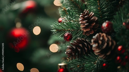 Festive red and green Christmas wreath composition background