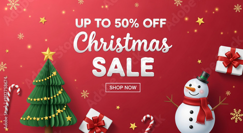 Festive red backdrop featuring a green tree, a snowman, gift box, and candy cane, promoting a Christmas sale, showcasing holiday shopping offers
