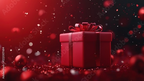 Festive red gift box surrounded by sparkling decorations