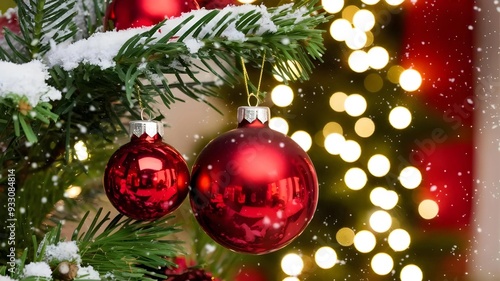 Festive Red Ornaments on Snow-Covered Christmas Tree