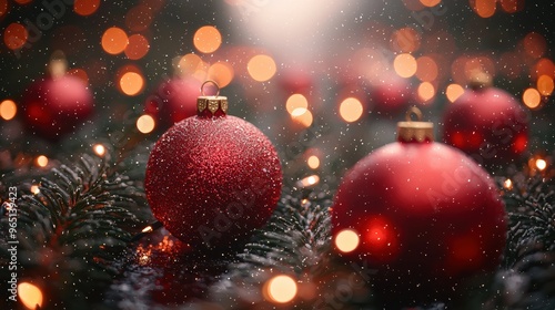 Festive red ornaments resting on evergreen branches with glowing lights during a snowy winter evening
