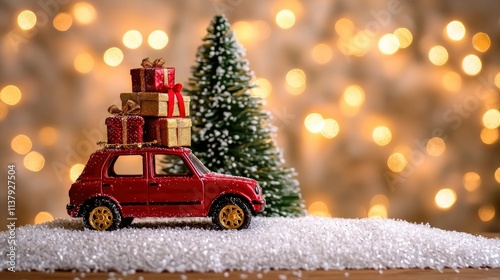 Festive Red Toy Car Loaded with Christmas Presents and Christmas Tree in Snowy Scene
