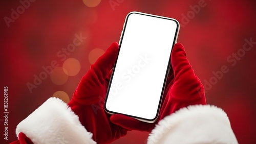 Festive Santa hands holding a contemporary blank screen mobile phone against a bokeh red background