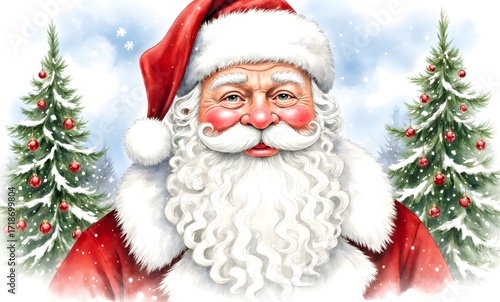 santa, white beard, christmas tree, snowflake, evergreen tree, christmas decoration, winter landscape, christmas spirit