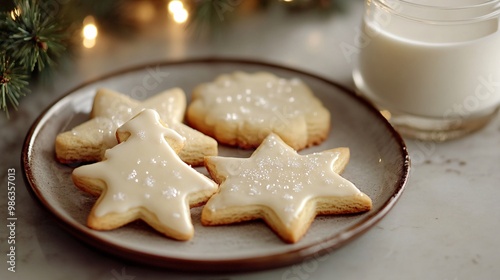 cookie, sugar, dessert, star, tree, frosting, festive, sweet, celebration, treat, food, holiday, plate, milk, edible, decoration, homemade, baked, seasonal, traditional, epicure, indulgence, snack, sweet, joy, winter, festive season, tasty, cheerful, ingredient