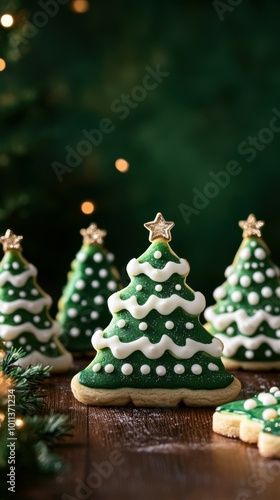 Festive sugar cookies shaped like Christmas trees, arranged on a wooden table with a deep emerald backdrop and warm holiday lighting, copy space, Merry Christmas background, holiday treat