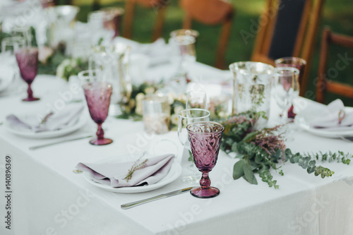Festive table served dishes and decorated with branches of greenery, stands on green grass in the area of wedding party
