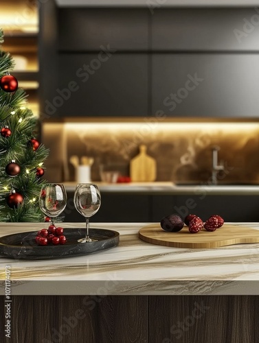 Festive table setting with wine glasses, berries, and a Christmas tree in the background. AI.