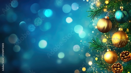 Festive teal bokeh background with gold and teal Christmas ornaments on a pine branch. Perfect for holiday greeting cards, websites, and social media posts, evokes joy and celebration.