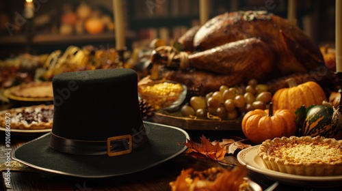 Festive Thanksgiving Feast with Black Pilgrim Hat and Roasted Turkey on Rustic Table Setting