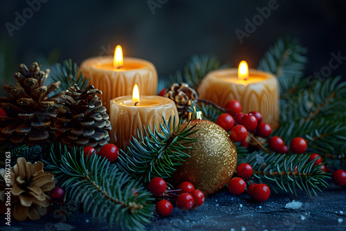 christmas, winter, candle, holiday, decoration, ornament, pine cone, berry, evergreen, festive, cosy, warm, celebration, seasonal, still life, dark background, gold, red, tradition, december