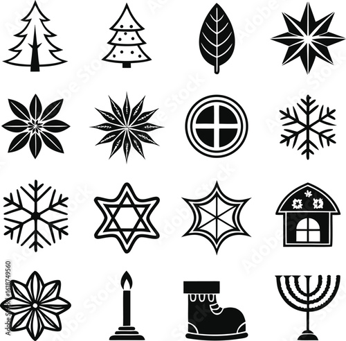 Festive winter celebration symbol set. Black and white graphic icons representing diverse holiday traditions like Christmas and Hanukkah.