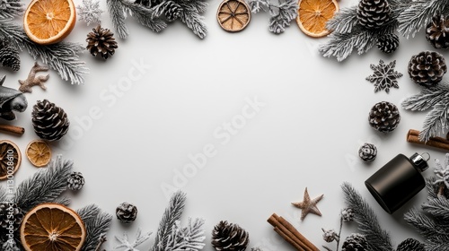 Festive winter frame with pine cones, cinnamon, dried oranges, and frosted branches on white background.