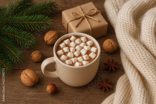 Festive winter scene featuring hot cocoa with marshmallows, pine branches, assorted nuts, a wrapped gift, and a cozy knit blanket for the holiday season