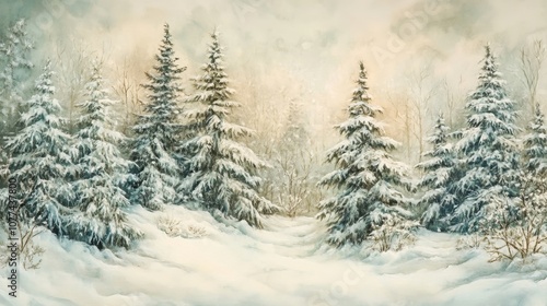 Festive winter scene with snow-laden evergreens and drifts. Season's greetings with space for text. Enchanting winter wonderland.