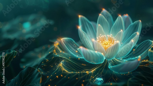 Fiber optic light painting, Chinese lotus flower, glowing cyan light, digital illustration, fantasy art style, holographic
