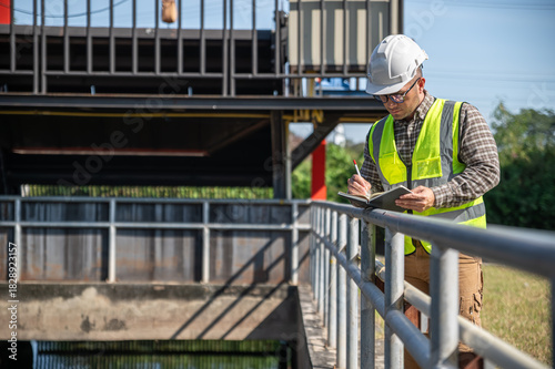 Field engineer taking notes during an outdoor inspection of the industrial water management facility