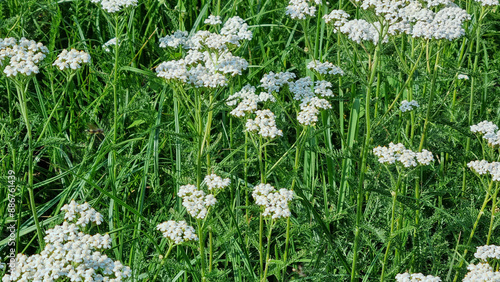 Field of blooming yarrow, natural landscape. Nature, flowers and grass. Selective focus