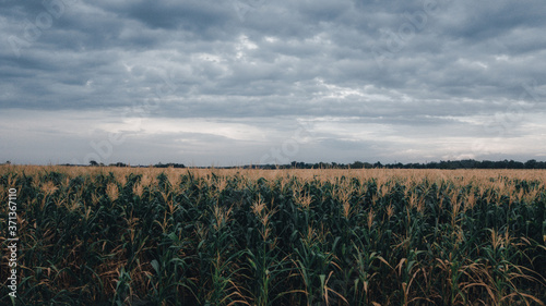 field, sky, corn, agriculture, landscape, green, farm, nature, blue, rural, crop, summer, plant, cloud, grass, cloud, cornfield, countryside, harvest, farming, food, country, maize, land, day