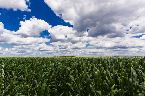 field of corn and white clouds and blue sky