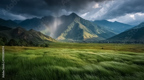 Field of grass with a mountain in the background. The sky is cloudy and the sun is shining through the clouds