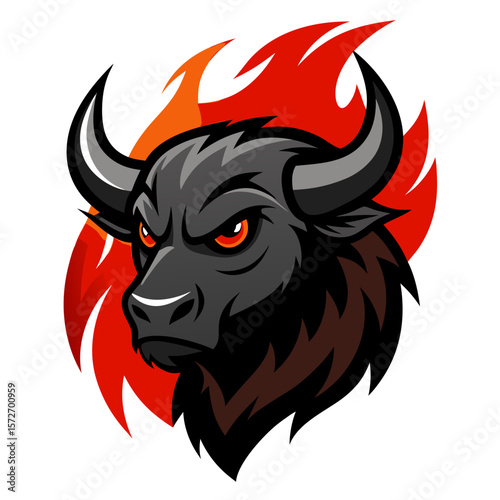 bull, head, logotype, mascot, illustration, icon, graphic, art, design, emblem, symbol, power, strength, aggressive, angry, fierce, rage, fire, flames, hot, energy, spirit, wild, nature, animal, mammal, horn, eye, face, profile, dark, black, red, orange, white
