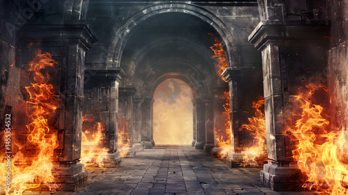 fire, flames, corridor, ancient, architecture, arch, stone, mediaeval, gothic, dramatic, inferno, blazing, pathway, fiery, ominous, labyrinth, mystical, fantasy, atmospheric, historic, burning, passageway, intense, dark, stronghold, warm, brick, mythical, engulfed, mysterious, hellish, striking, captivating, fantasyland, vortex