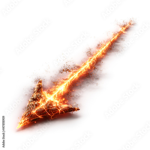 arrow, fire, flames, burning, spark, flight, trajectory, energy, power, speed, motion, white background, downward, direction, decayed, fall, descent, hot, intense, fiery, orange, red, gold, light, bright, glowing, abstract, digital artwork, design, graphic, element, illustration