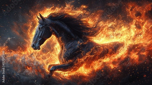 horse, fire, flames, black, majestic, powerful, speed, running, leaping, digital, art, fantasy, vibrant, glowing, fiery, energy, wild, freedom, action, movement, dynamic, dramatic, dark, sparkling, intense, imagination, creative, painting, beautiful, style, silhouette, energetic, strong, passion, epic, galloping, fierce, spirit