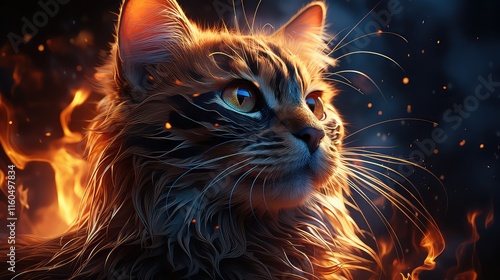 cat, fire, flames, ember, blaze, fur, whisker, eye, orange, brown, tabby, long hair, digital artwork, painting, artwork, illustration, felino, animal, pet, mammal, creature, fiery, glowing, intense, dark, background, spark, heat, warmth, light, shadow, texture, line, colours, artistic, creative, fantasy, surreal, mythical, magical, powerful, mysterious, abstract, wildlife, nature, beauty