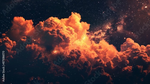 Fiery clouds and starry night sky. Dramatic image of fiery orange clouds set against a backdrop of a star-filled night sky, perfect for projects on space, astronomy, and fantasy.
