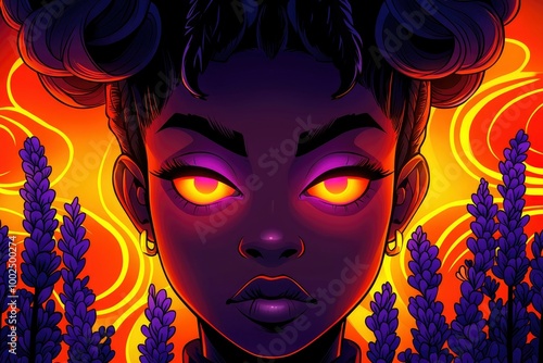 woman, female, portrait, face, eye, glowing, fiery, orange, purple, lavandula, flower, art, illustration, digital artwork, graphic, design, abstract, background, mood, fantasy, mystical, magical, mysterious, surreal, emotion, expression, strength, power, beauty, character, portraiture, contemporary, modern, colourful, vibrant, creative, artistic, artwork, wallpaper, avatar