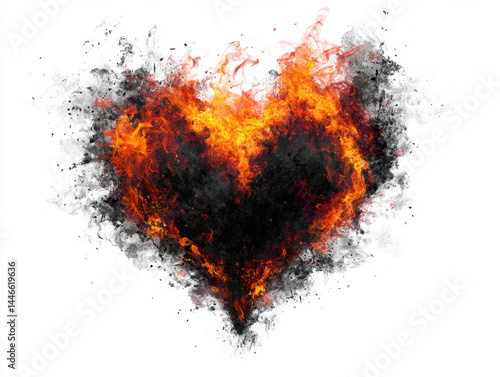 Fiery heart shape made of black smoke and bright orange flames on white background, symbolizing intense passion and burning emotion in dramatic display