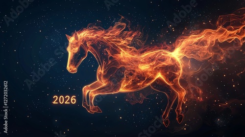 glowing, dreamlike, stellar, horse, illumination, surreal, magical, art, silhouette, celestial, galloping, power, mythical, universe, fiery, starry, movement, blazing, fantasy, night, year, fire, warm, light, radiance, spark, abstract, cosmic, flames, energy, aethereal, outline, symbolism, dynamic, space, glow, atmosphere, bright, 2026, burning, vibrant, sky, shine, orange, star, mystical